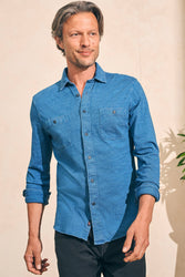 - Faherty Sunwashed Knit Seasons Shirt Double Pocket in Medium Indigo Wash
