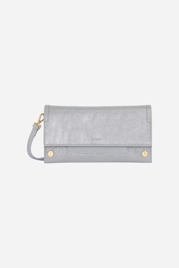 A new addition to our selection of structured styles, AJ looks sleek as a special event clutch or crossbody wallet, designed with a removable strap and organization in mind. Reminiscent of sunlight reflecting off calm ripples alongside boats in the Marina del Rey Harbor, this cool grey Italian patent with blue undertones is smooth to the touch and finished with a textured wrinkle effect.