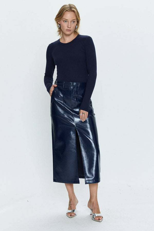 Elevating our most popular fit with utility patch pockets in a matte shine vinyl fabric to make the navy color pop. Designed into a midi length, it looks more polished and has the fashionable function of a front slit for freedom of movement.