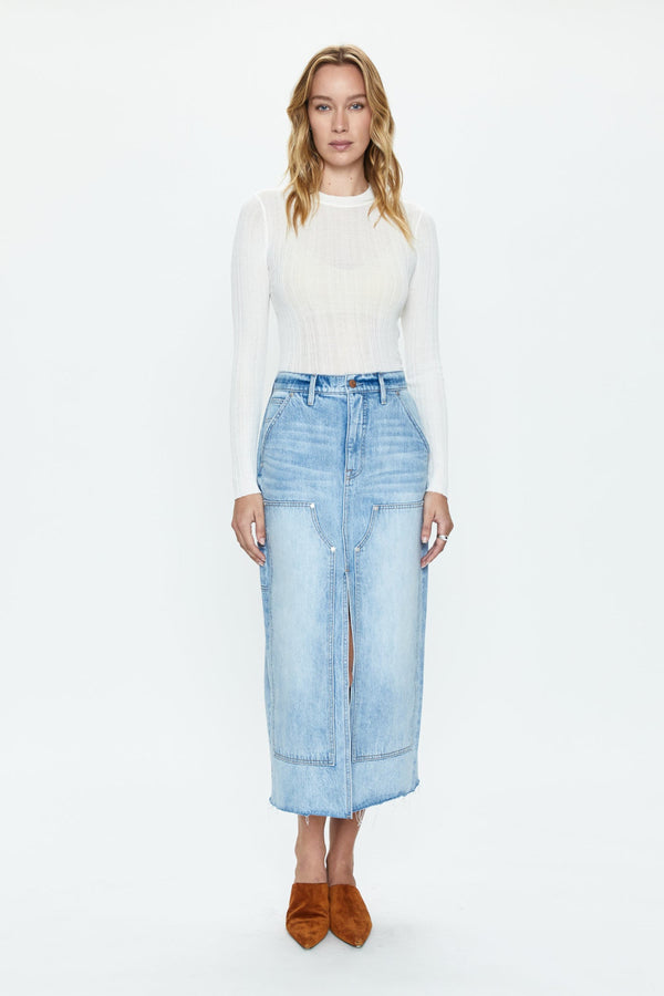 Of-the-moment, yet eternally stylish - our best selling skirt features an elongated midi length and five pocket denim design notes. Crafted from rigid denim without stretch for sophisticated fit and fall, with a well considered front skirt slit for ease of movement. Reimagined for the season with workwear inspired utility detailing in a light denim wash.