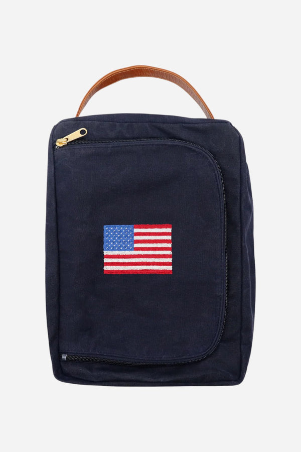Smathers & Branson American Flag Shoe Bags are crafted from 100% hand-stitched needlepoint on durable, weather-resistant waxed cotton canvas, complemented by full-grain Italian leather details. Designed for functionality, the bag features an easy-to-clean nylon lining. Lightweight and versatile, it’s perfect for keeping your shoes separate from your luggage or storing your golf shoes in style.