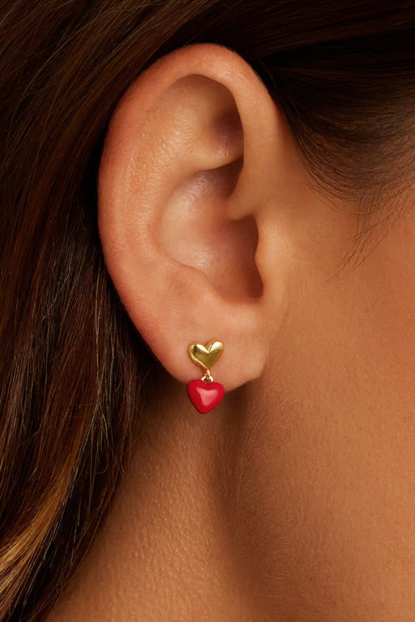 Double the hearts, double the fun. Perfect in first, second or third piercings, add a bit of love to your ear stack with this stacked gold and red enamel heart earring.