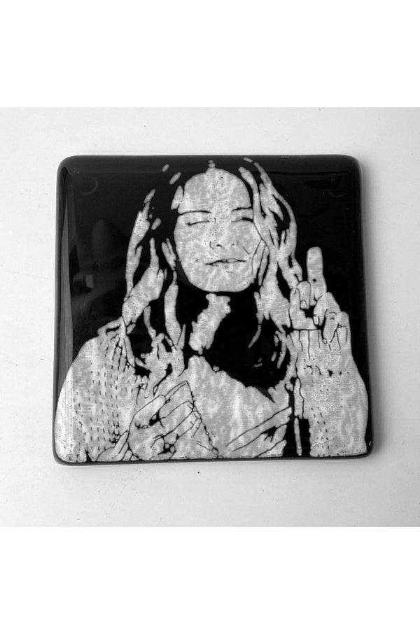 4x4" screen printed, fused glass coasters featuring your favorite iconic personalities. This coaster features actor Annie Murphy screen printed with white enamel onto charcoal glass.