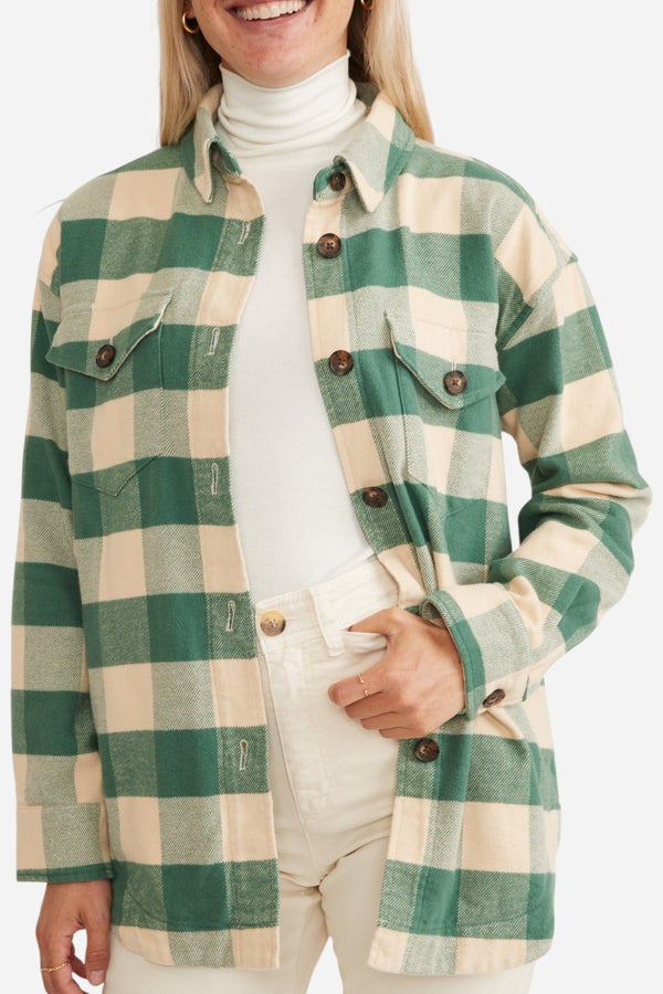 Now you can stop stealing his overshirt. We created this insanely cozy gem in a classic plaid print that goes with basically everything. It's long enough to cover your butt, with a saddle hem for a little extra style. Pair it with denim, boots, tees, and boom—your go-to fall outfit.