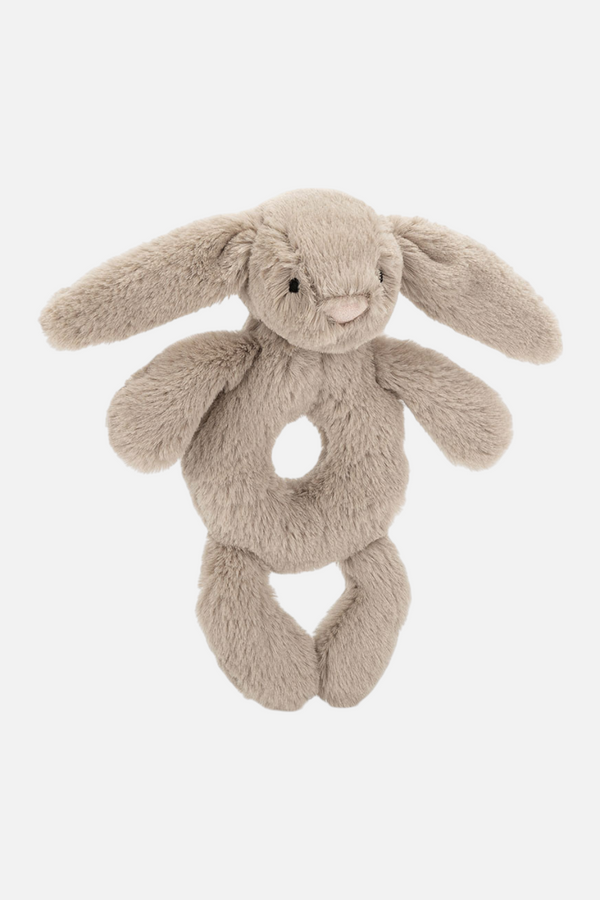 Designed with tiny hands in mind, the Jellycat Bashful Blush Bunny Ring Rattle combines gentle textures and thoughtful design. Its soft limbs and elongated ears invite delicate touch, while the ring-shaped tummy ensures an effortless grip and adds to its charm. Echoing the beloved Bashful Bunny, it features a pink suedette nose and plush, velvety fur. Accompanied by a soothing sensory rattle, this elegant keepsake makes a refined first gift that both comforts and captivates.