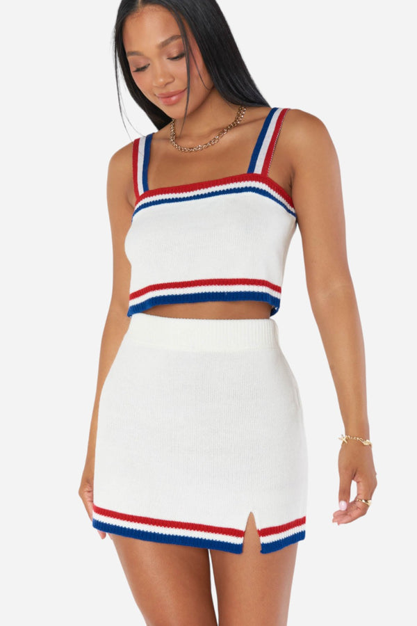 Yacht summer in the Below Deck Mini Skirt. A preppy fitted knit skirt with a side slit and varsity striped hem. Get ready to set sail in the matching Below Deck Tank and Lambert Cardigan paired with canvas sneakers.