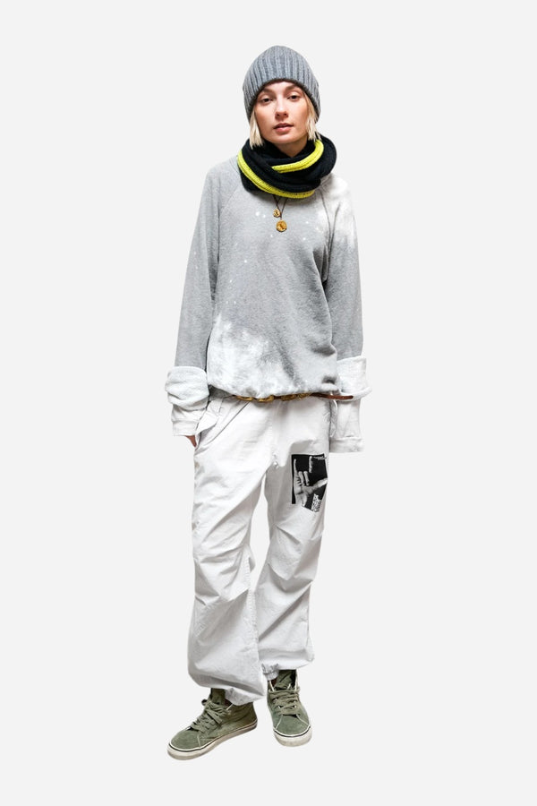 The FREECITY LUCKYRABBIT sweatshirt in heather bleach-out, featuring a custom partial hand-bleach process for unique highs and lows, finished with a signature golden pin.