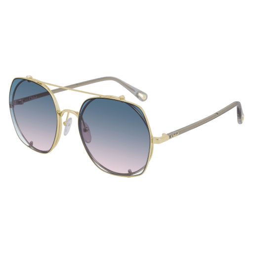 Gold/Gray (002) Sunglasses with Light Blue Gradient lenses (CH0042S 002 56) by Chloé™. Size: 56-20-145, Shape: Round/Square, Material: Metal.