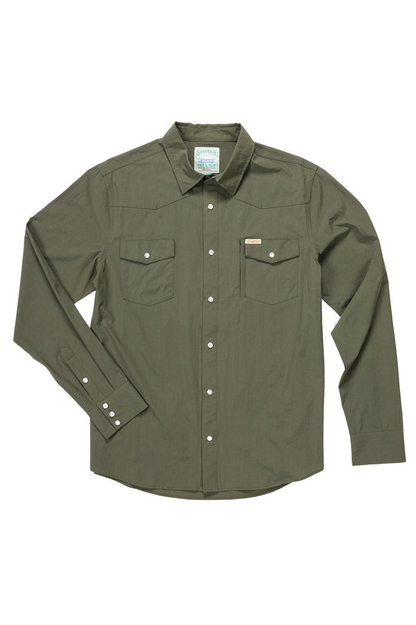 We’ve taken the classic design of our Western Wyatt Pearl Snap Shirt and combined it with lightweight, breathable performance material with just a hint of stretch to it. This isn’t just a “fishing shirt.” It’s light as a feather, tough as a Texas steer, and it’s got snaps, trims, and a zipper pocket enough to make a rattlesnake jealous. Unlike other performance pearl snaps out there, we’ve given The Confluence a tailored fit so it’s not going to look like you’re wearing a garbage bag. Whether you’re out paddling the río or headed out to a nice dinner in this thing, it’s the perfect shirt for both style and comfort.