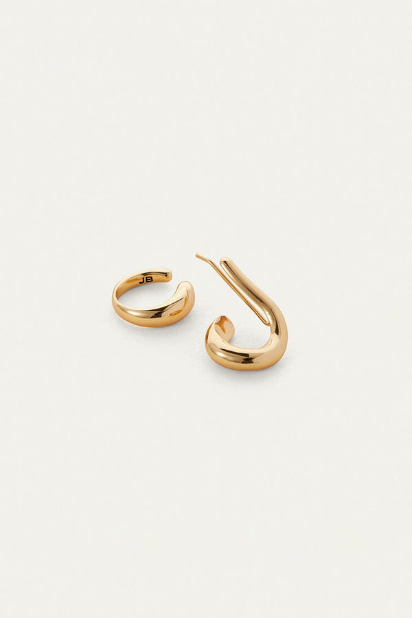 A set of one modern ear cuff and a one ear climber, for an asymmetrical look or to fill in the gaps in your ear stack. The Ear Climber is designed to fit on the right ear only. Ear cuff can be gently squeezed in place to find your perfect fit. Finished in high-polish gold.