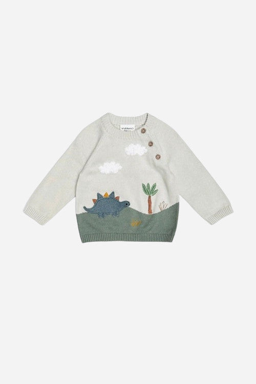 100% organic cotton sweater knit baby pullover featuring whimsical dinosaur applique patch, embroidery & jacquard design.