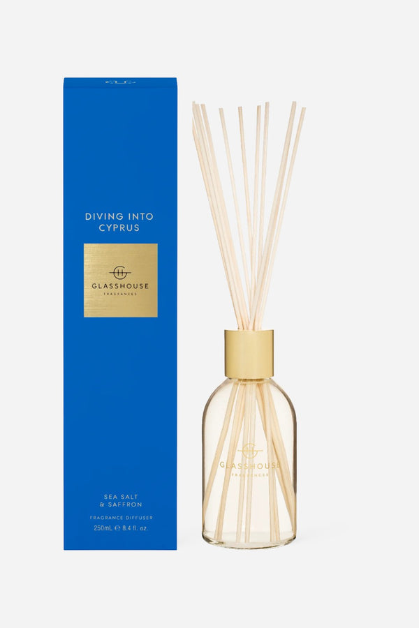 The Glasshouse Diving into Cyprus Fragrance Diffuser is a clever flameless scent solution for uninterrupted ambience. Like a dip in the Med sea, with amber and peach balanced by woods, lavender and moss.