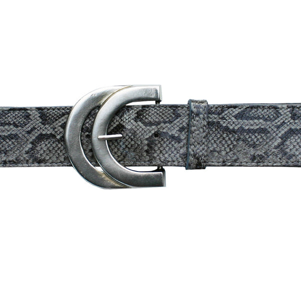 A great statement belt in grey snake combined with a large antique nickel buckle. The buckle has a classic 80s feel, with two half circles repeating. The leather is a snake print with a flossy finish, backed with grey suede and sewn. We love it! Regarding sizing: each belt has 5 holes spaced 1" apart, the sizing below is the measurement to the middle hole (allowing for 2" adjustment on either side).