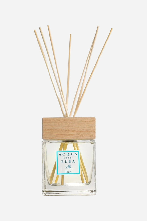 Acqua dell'Elba's Fiori Fragrance Diffuser has a floral harmony featuring essential oils of broom, myrtle, jasmine, cistus, and the woody notes of Mediterranean shrubs.