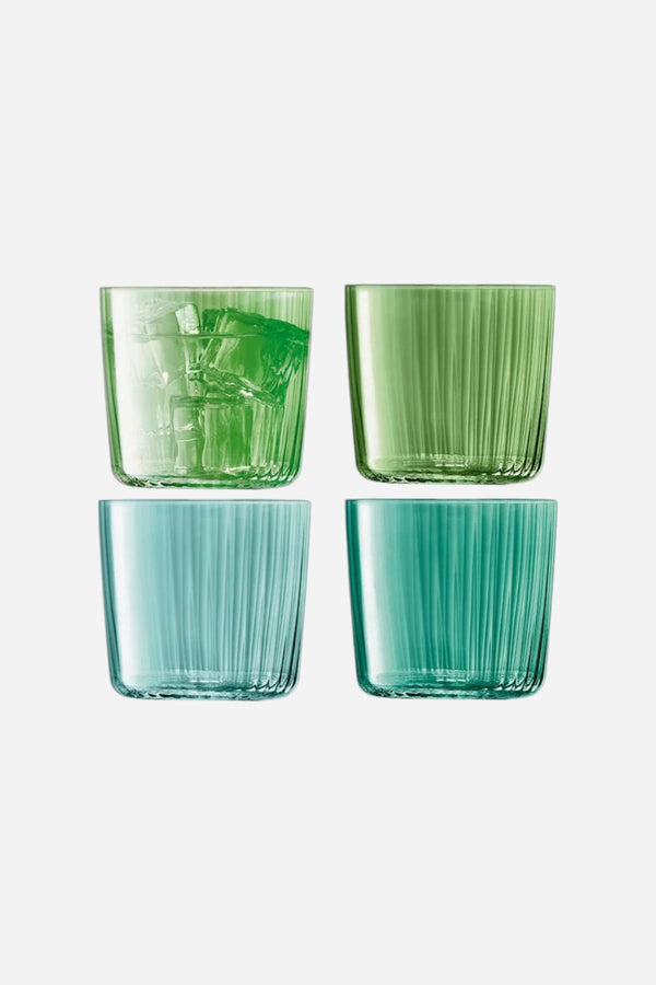 Four low, fine-walled tumblers with a fluted texture. Hand painted in assorted sheer lustres of the same tone, inspired by the colour of semi-precious gems.