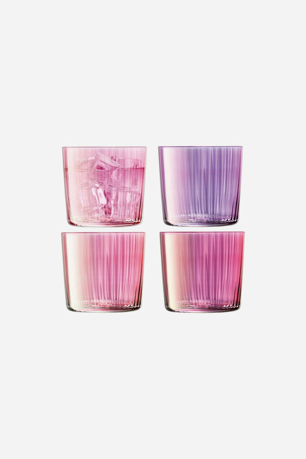 Four low, fine-walled tumblers with a fluted texture. Hand painted in assorted sheer lustres of the same tone, inspired by the colour of semi-precious gems.