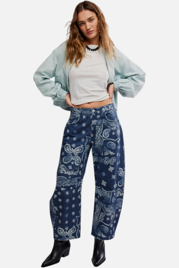 Introducing the Good Luck Printed Barrel Jean from Free People's We The Free collection—a heritage-inspired staple reimagined in a playful navy bandana print. This mid-rise, slouchy silhouette features a relaxed wide-leg cut with subtle distressing and refined seam detailing throughout. The rigid denim fabrication and tapered ankle hem create an effortlessly cool, lived-in aesthetic. Note: This style runs slightly large; we recommend sizing down one size. Consciously crafted to reduce environmental impact, this bold pair is the perfect addition to any denim wardrobe.