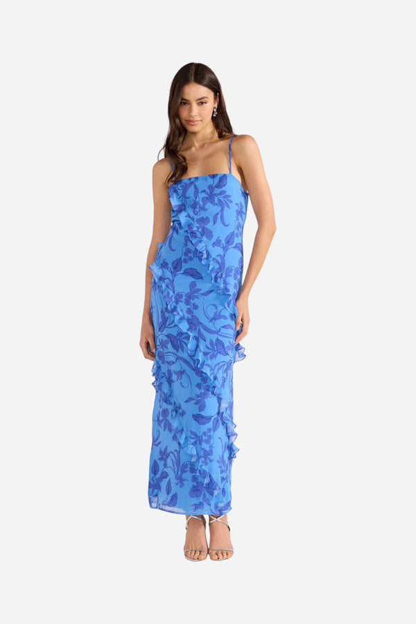 Designed to move with you, the MINKPINK Jeanne Ruffle Maxi Dress is your new showstopper. Featuring a bold cobalt blue floral print and cascading ruffles that sway with every step, it strikes the perfect balance between elegance and fun.