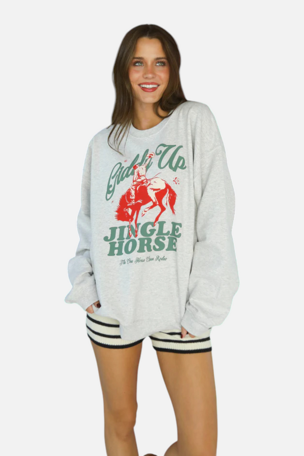 Embrace the spirit of the season with our Jingle Horse Sweatshirt, a sophisticated take on holiday tradition. This charcoal grey crewneck showcases a striking "Giddy Up Jingle Horse" graphic featuring a spirited bucking bronco, blending western charm with festive cheer. Versatile enough for holiday gatherings, intimate evenings by the fire, or everyday wear, this sweatshirt adds an unexpected touch of personality to your seasonal rotation. Crafted for comfort and style, it's the perfect piece for those who appreciate wit and individuality in their holiday fashion.
