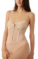 A stunning boudoir essential, this sultry bodysuit is featured in a sheer mesh fabrication with underwire cup detailing and front hook-and-eye closures for added dimension.