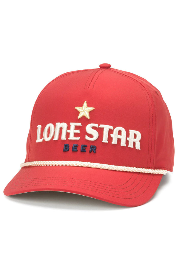 5-panel hat with mesh stay behind the front panel. Curved brim and plastic snap backstrap. Thick nylon cord across front. Front logo is lofted embroidery.