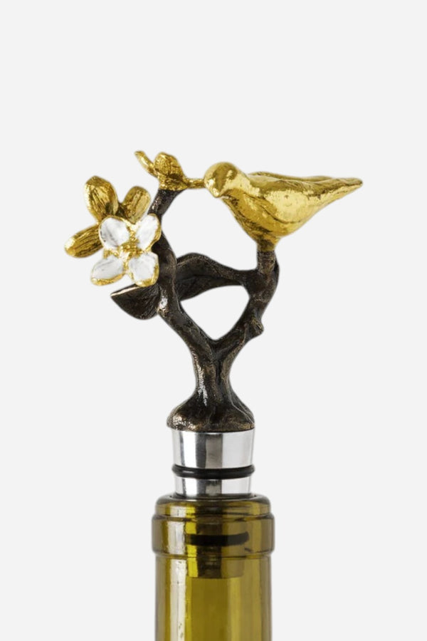 The Michael Aram Lovebirds Wine Stopper celebrates the deep-seated human need to connect and bond with one another. The branch the birds perch on symbolizes growth, evoking the imagery of the tree of life. The white, four-petaled flowers represent wholeness, unity, and innocence.