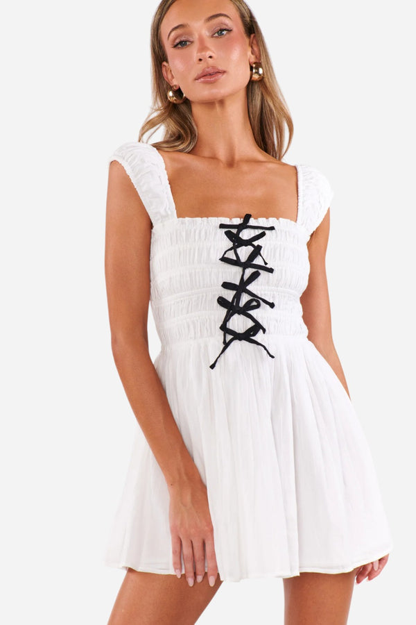 With its playful fit-and-flare silhouette and smocked bodice, this mini is all about effortless charm and all-day comfort. Dainty black bow details add a touch of whimsy and standout style, making it the perfect pick for warm-weather days when you want to feel cute, confident, and just a little dressed up.