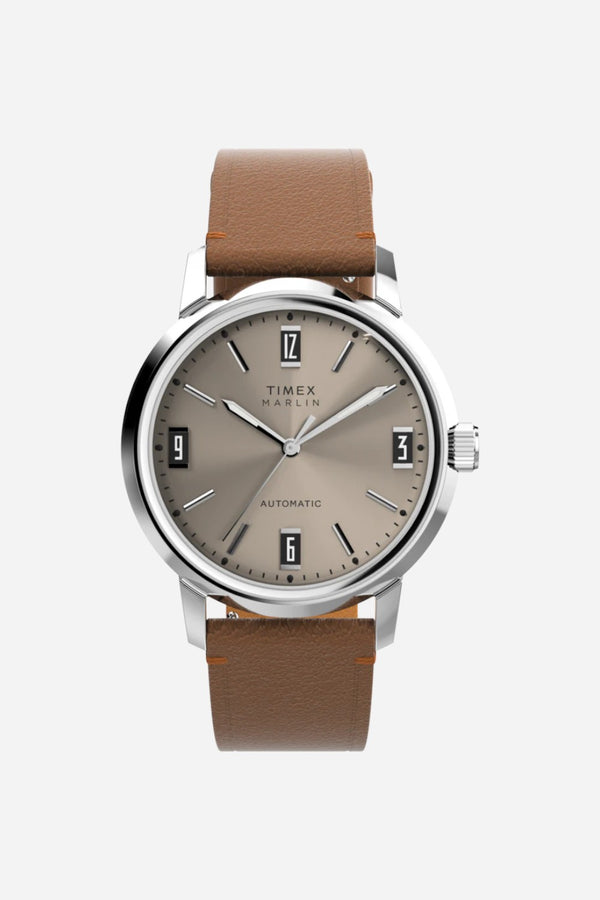Ticking inside this iteration of our iconic 1960s Marlin is a tried-and-true 21-jewel Japanese automatic movement, creating a contemporary timepiece that honors our watchmaking history. Powered by your motion as you wear the watch, the movement can store a maximum 40 hours of energy. If motionless for longer than 40 hours, wind the watch using the crown until you feel resistance, set the time, and place it back on your wrist where every motion will supply the energy. True to our original Marlin design, this watch features the iconic domed acrylic crystal and retro-style applied indices, complemented by a sturdy 40mm recycled stainless-steel case with exhibition caseback and a deep champagne dial. Paired with an eco-friendly natural leather strap sourced from the Leather Working Group (LWG).