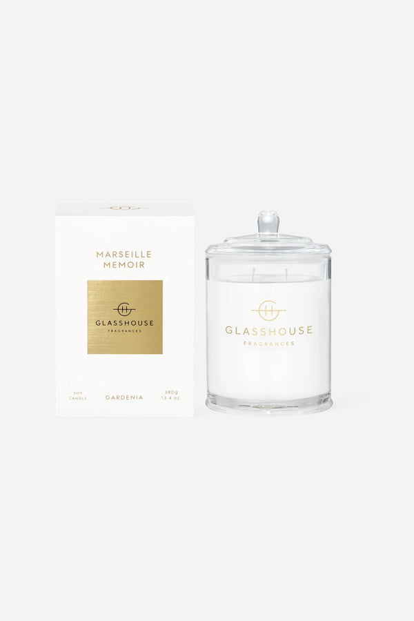 The Glasshouse Marseille Memoir Candle is a fresh green floral with a blend of Gardenia, Tuberose, and Neroli.