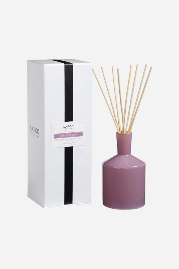 Twilight blankets the adobe terrace, where succulent wild raspberry blends with night-blooming cactus blossoms, embraced by aromatic amber and cedarwood. A lush sweetness and earthy allure evoke the magic of a mystical desert oasis in this LAFCO Midnight Cactus Classic Reed Diffuser.