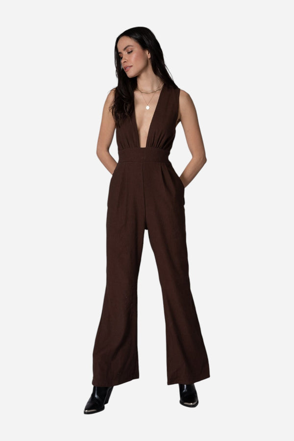 A plunging V neckline with banded waist and wide leg full length pants, back zip and button closurer.