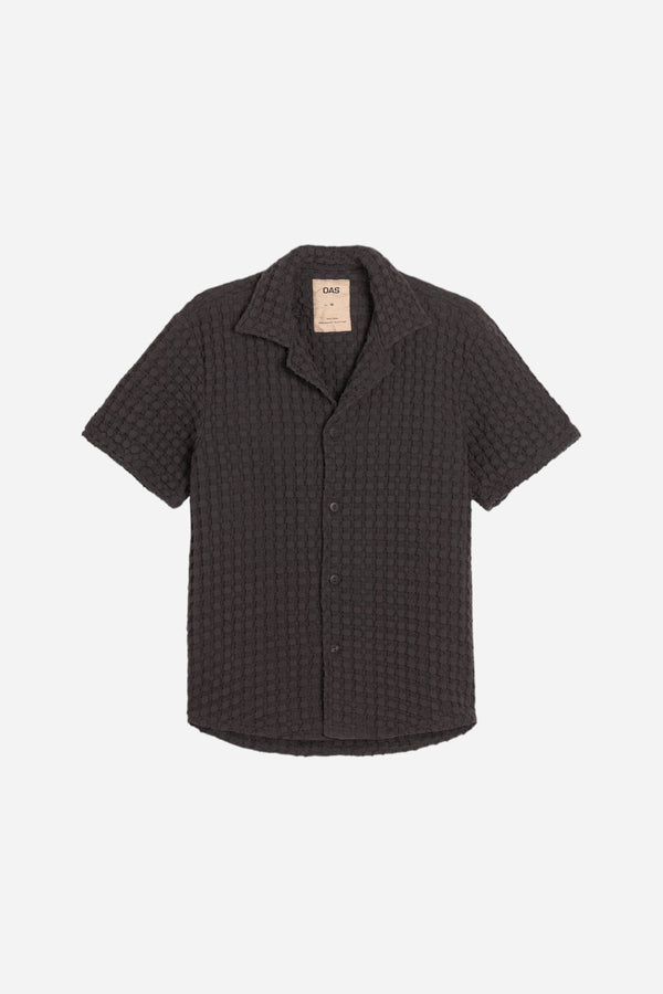 The Nearly Black Cuba Waffle Shirt is woven with generous amounts of cotton to a waffle texture that feels particularly soft and breezy against skin. The relaxed silhouette features boxy sleeves, a resort collar and horn buttons running down the front.