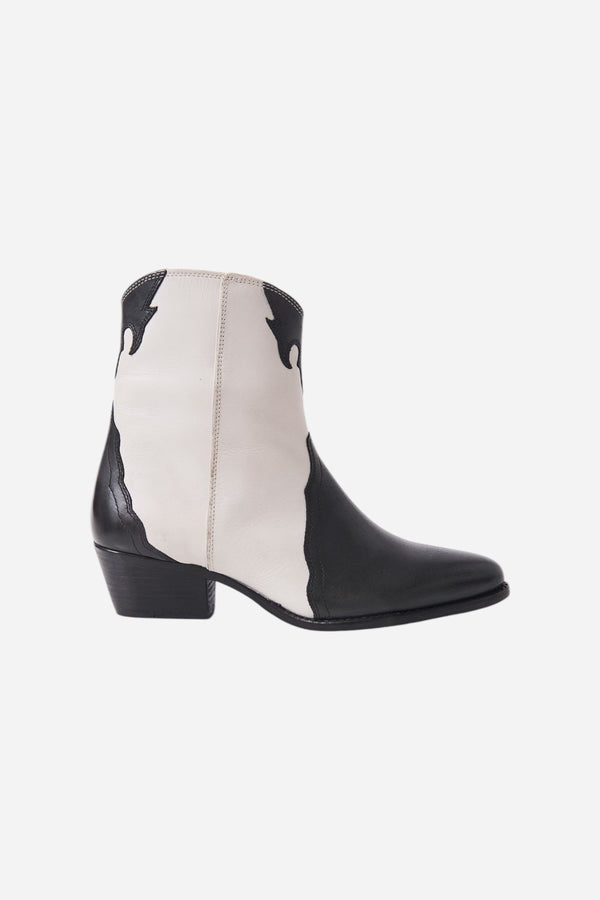 Stand out in these patent leather ankle boots in a western-inspired silhouette featuring a stacked heel and pointed toe.