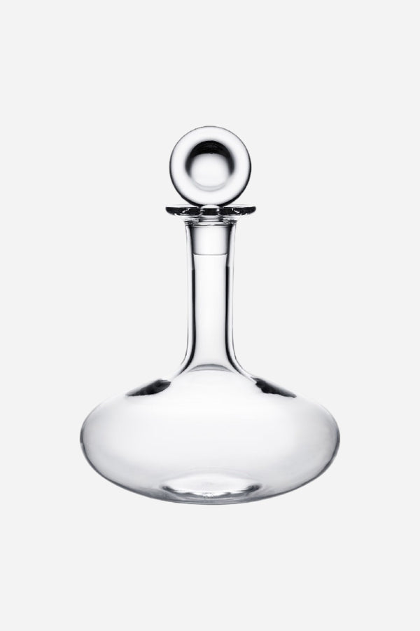 The « Oenologie » decanter in clear crystal is ideal for airing a young wine and releasing its flavors. The shape recalls the volumetric bottles seen in laboratories. Decanting a young wine allows its aromas to develop and be savored later: airing it out releases its full flavor. Decanting may also be a fitting option for older wine that has yet to reach complete maturity. The Baccarat Clear crystal Oenologie Decanter is not only a vehicle that helps the wine achieve its full integrity; it is also a stunningly crafted piece. Its build echoes that of a laboratory volumetric flask, but its functional form is elevated thanks to the exquisite Baccarat Clear crystal and its exceptional design flourishes. The poise of the slender neck morphs gracefully into the elliptically-shaped base. The stopper crowns the silhouette with a perfectly rounded loop of Baccarat Clear crystal.