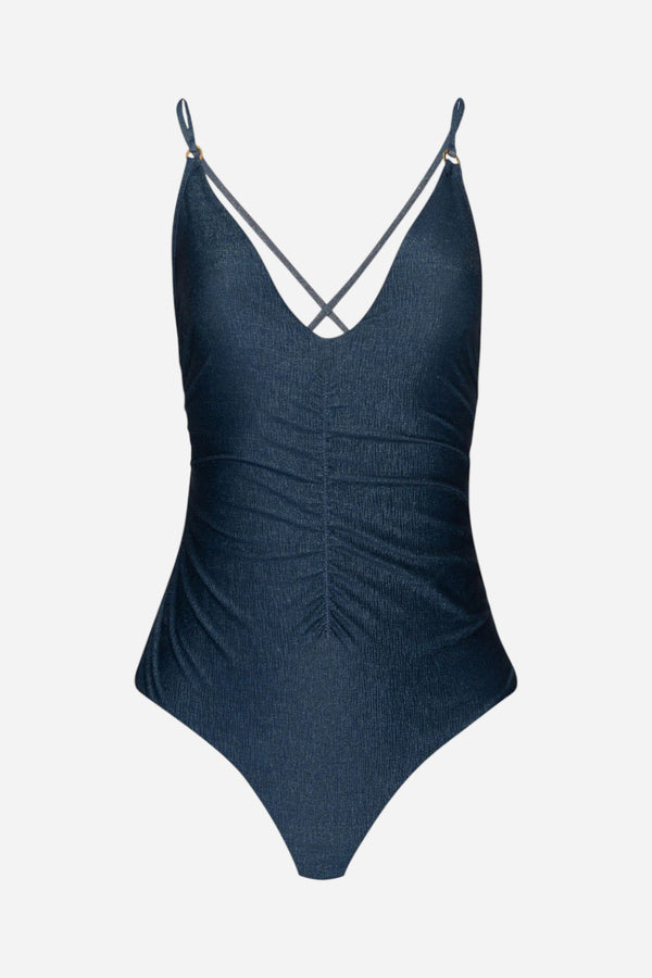 Designed to make a statement, this striking suit features a plunging V-neckline and cinched detailing that enhances and flatters your natural shape. The adjustable criss-cross back ties offer a customized fit, while 24k gold-dipped ring accents lend a luxurious finish. Bold, feminine, and effortlessly sophisticated—Penelope is your go-to for standout swim style.