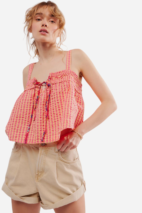 Perfectly printed, this gingham top is featured in a billowy silhouette and sleeveless-style with adjustable tie-front detailing and smocked fixed shoulder straps.