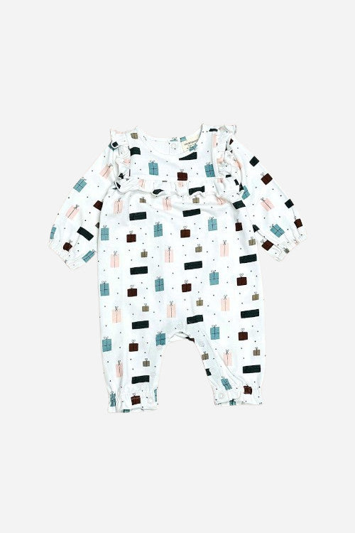 Long Sleeve Coverall Romper With Ruffle & Flutter Detail, Organic Cotton Stretch Jersey.