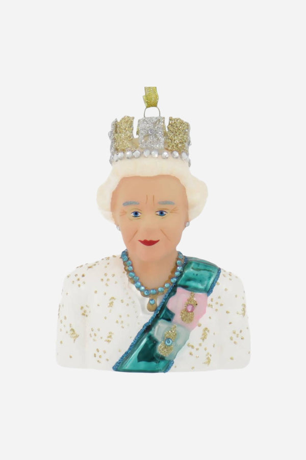 This wonderful design features the a bust statue design of the queen with white hair and wearing a white with gold accents top, an alternating gold and silver crown with clear faceted beads around the entire head band, faceted blue beads for the necklace and blue sash with gold glitter and faceted beads. The crown is makes of plastic for break-resistance. All sides are nicely detailed and it includes a gold sheer ribbon ornament string.