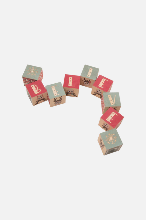 Uncle Goose Reindeer "Believe" Blocks transform holiday décor into an interactive experience. This nine-block set celebrates Santa's iconic team, with each block showcasing a different reindeer alongside their names embroidered on festive stockings. Spell "BELIEVE" using seven red and green blocks while discovering snowflake designs on the remaining two. Cozy knit patterns adorn every side, creating a sophisticated aesthetic that bridges playful engagement with refined seasonal styling. Perfect for curating memorable holiday moments and elevating your winter display.