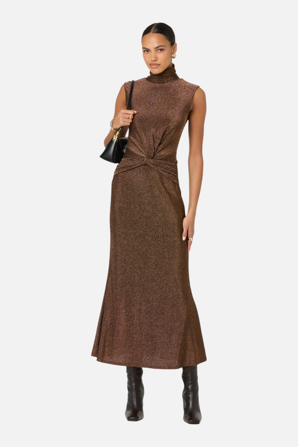 Make a striking entrance in this metallic maxi dress, designed for those moments that demand elegance. The signature twist front detail creates an eye-catching focal point, while the shimmering brown metallic finish catches light beautifully throughout the evening. Featuring a sleek tank silhouette with a refined turtleneck, this pullover style offers effortless sophistication. Fully lined for comfort and confidence, the Riana dress transitions seamlessly from cocktail events to formal celebrations, delivering understated glamour with every wear.