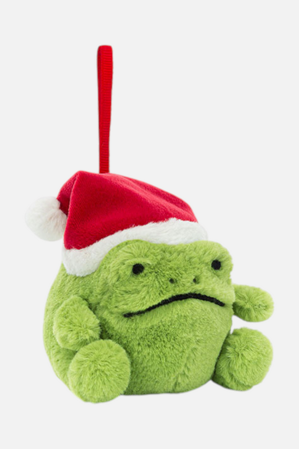 Add a touch of refined whimsy to your holiday décor with the Jellycat Ricky Rain Frog Ornament. Featuring Ricky’s signature grumpy embroidered expression, this charming mini frog dons a crimson hat trimmed in cream with a delicate pompom, secured by a rich red textured ribbon. Perfect for bringing subtle character and elegance to your Christmas tree, this ornament offers a sophisticated twist on festive cheer.