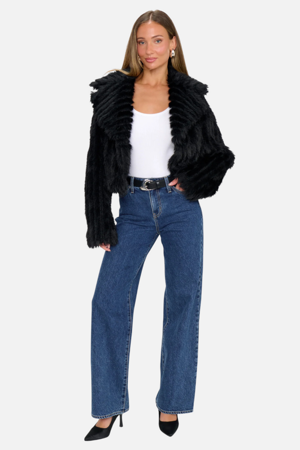 Elevate your wardrobe with the Women's Show Me Your Mumu Salt Lake City Cropped Jacket in Black Faux Fur. Crafted from luxuriously soft, fluffy faux fur, this jacket offers both warmth and elegance. Wear it open for a relaxed, chic look or secure it with the discreet hook and eye closure to embrace cozy sophistication. Perfect for adding a refined touch to any outfit, this cropped jacket effortlessly combines comfort and style.