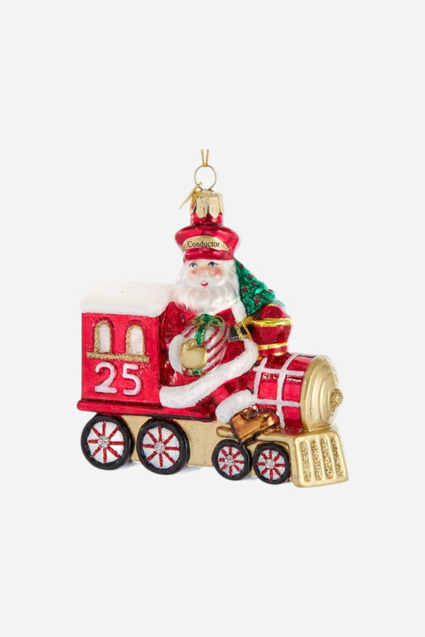 Choo, choo! The Christmas train is coming through! This Santa Claus has donned a conductor's hat in order to take the train to deliver Christmas presents this year. He holds a present and tree in his hands as he sits at the front of the train. With peppermint striped wheels and the number "25" marking Christmas day on the side, this is a train made for celebrating! Those who love both Christmas and fanciful locomotives will have so much fun seeing this Santa with Red Train ornament on their tree!