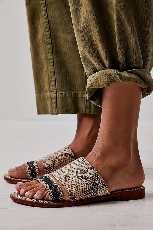 Features: Slip-on style, backless design, leather fabrication, thick toe strap, thin textured strap, flat sole, lined footbed
