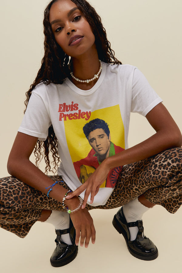 The King of Rock and Roll, ladies and gentlemen. Featuring a bright, multi-colored photo of Elvis with his 1954 U.S. tour locations stamped on the back. Printed with coloring and technique that gives off the true feeling that this tee came right out of his era.
