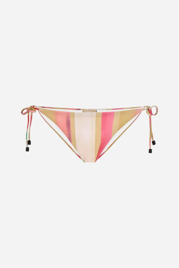 The Sunset Pop print reminds us of a vertical sunrise at the beach. With their golden, pink, and turquoise hues, the Azzura bottom is created out of 85% Recycled Polyester and 15% Elastane. The low-waisted, fully lined tanga-style bottom is finished with ties on both sides for easy adjustment and a scrunch detail in the back - creating the ultimate summer classic.