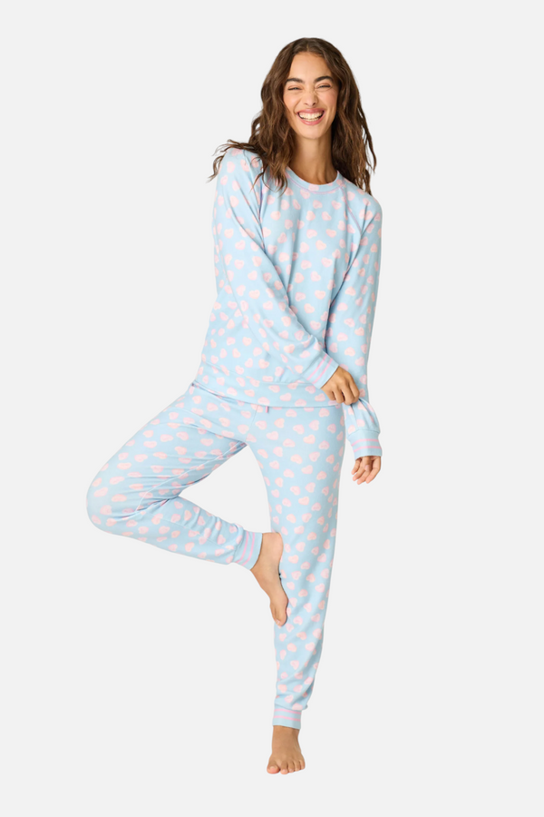 Indulge in refined comfort with this elegant pajama set, where whimsical sentiment meets understated sophistication. The soft peachy jersey construction drapes beautifully in a long-sleeve crewneck silhouette, while delicate pastel hearts bearing "Love" add a touch of nostalgic charm without compromising polish. Finished with gently cuffed pants, this set transforms your evening routine into a moment of quiet luxury—perfect for those who appreciate both style and substance in their sleepwear.