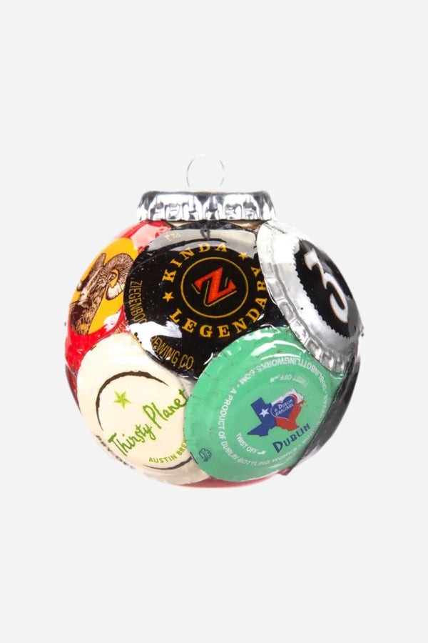 Ornament created from bottle caps of various Texas state breweries. The perfect gift for the most difficult on your list. Each reclaimed bottle cap is individually pressed and hammered to achieve just the right shape. The caps are bonded to each other to form the ornament so the inside is hollow. The finished product is more durable than a glass ornament. You won't find these anywhere else in the world. 10% of Kaps for Kids sales are donated to various children's charities. Save your caps!