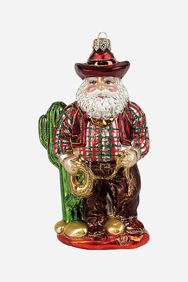 Celebrate the Lone Star State with the Texas Santa with Lasso Polish Mouth-Blown Glass Christmas Ornament from Pinnacle Peak Trading. This intricately crafted ornament showcases the festive fusion of Texas pride and holiday cheer. Hang this beautifully detailed Santa with lasso on your tree for a touch of Texan charm and Christmas spirit.