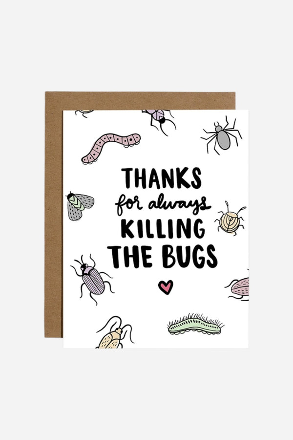 Real ones know. Send this love card over to your special someone who handles it all. Reads "thanks for always killing the bugs" in black lettering with adorable hand drawn bug graphics all around it! White background.